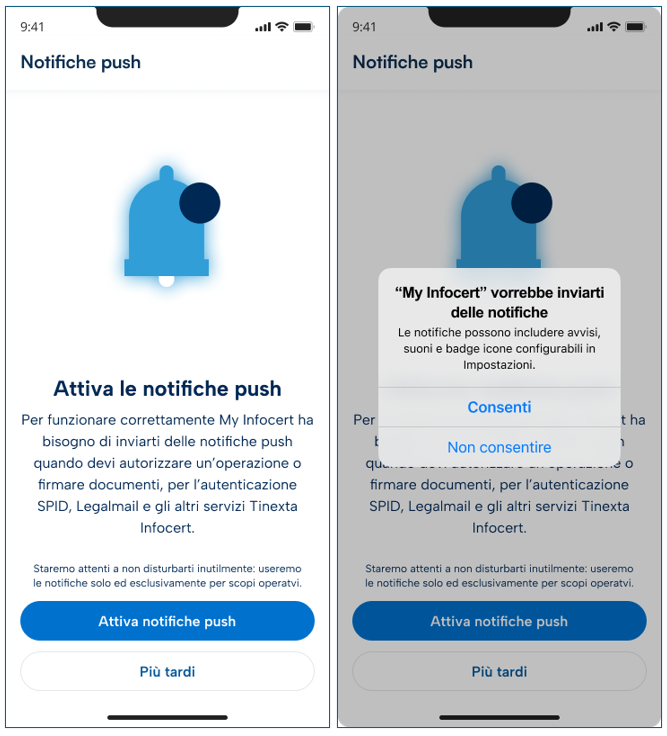 Per funzionare correttamente My Infocert ha bisogno di inviarti delle “notifiche push” quando devi autorizzare un’operazione o firmare documenti, per l’autenticazione SPID, Legalmail e gli altri servizi InfoCert.