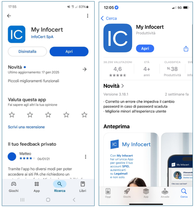 Una volta avviato Google Play, Apple Store o Microsoft Store, inserisci “My Infocert“ come elemento di ricerca. Un clic sul pulsante Installa o Ottieni (in base al sistema del mio cellulare) permette di proseguire ed installare l’App sul proprio dispositivo.