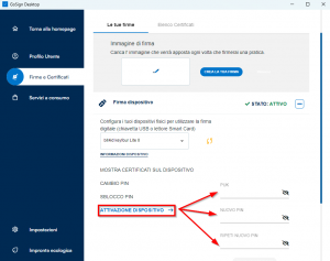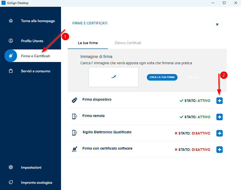 dove si visualizza il menù “Firma e Certificati”(1). Nella sezione Firma dispositivo cliccare sul + vicino allo stato ATTIVO