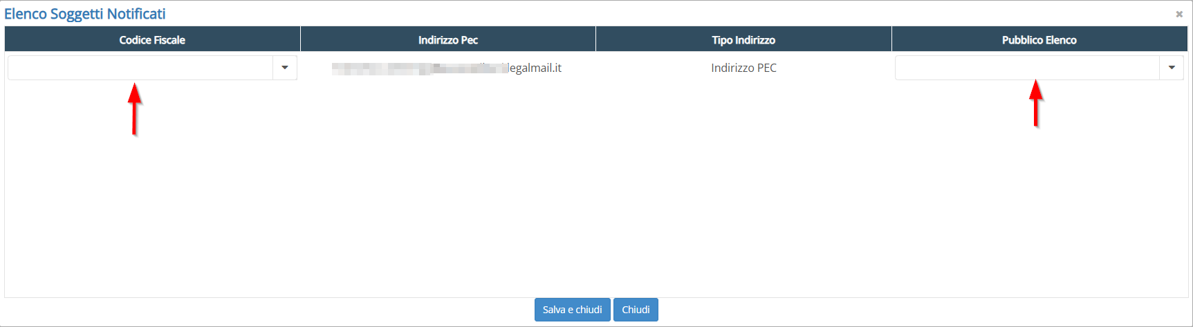 Da questa schermata sarà possibile inserire il codice fiscale e selezionare il pubblico elenco per ciascun soggetto notificato.