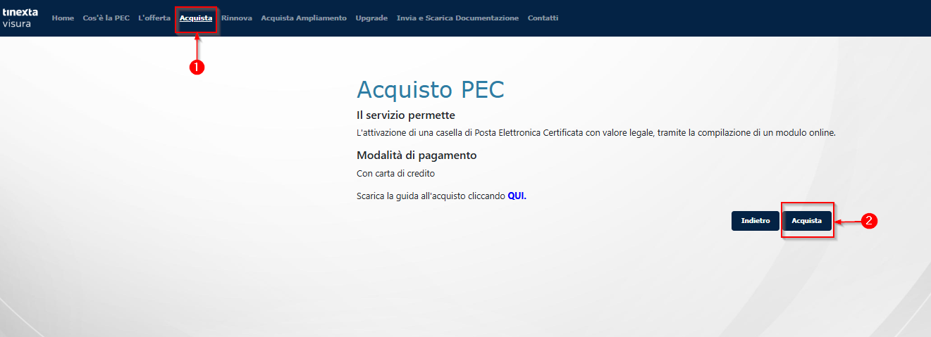 Collegarsi al sito www.visurapec.it , cliccare sull’apposita voce “acquista” (1) nel menù orizzontale in alto e, in basso a destra, “acquista” (2):