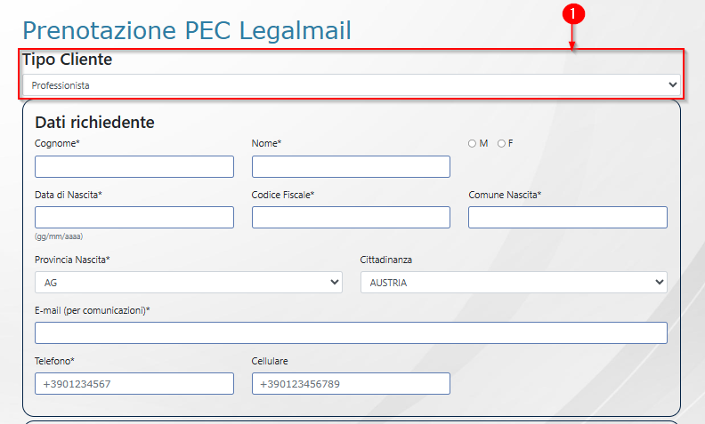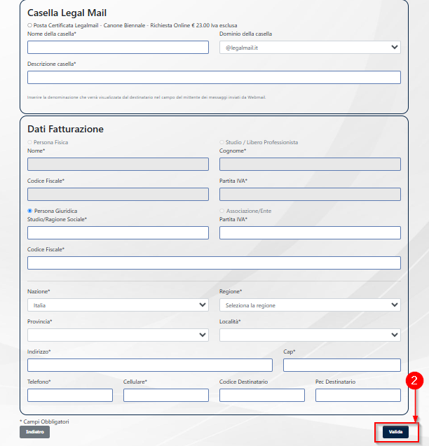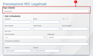 Successivamente selezionare la “tipologia di cliente”(1) che vuole effettuare l’acquisto (“Impresa”, “Professionista”, “Privato”) e compilare il modulo di richiesta della casella in tutti i suoi campi, scegliendo l’indirizzo PEC che si vuole acquistare e infine cliccare su “valida”(2)