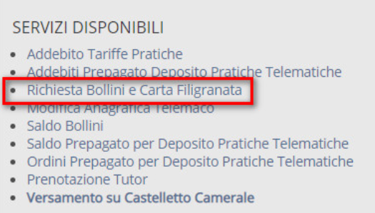 Nella pagina che si aprirà a video, nell’area SERVIZI DISPONIBILI cliccare sulla voce RICHIESTA BOLLINI E CARTA FILIGRANATA: