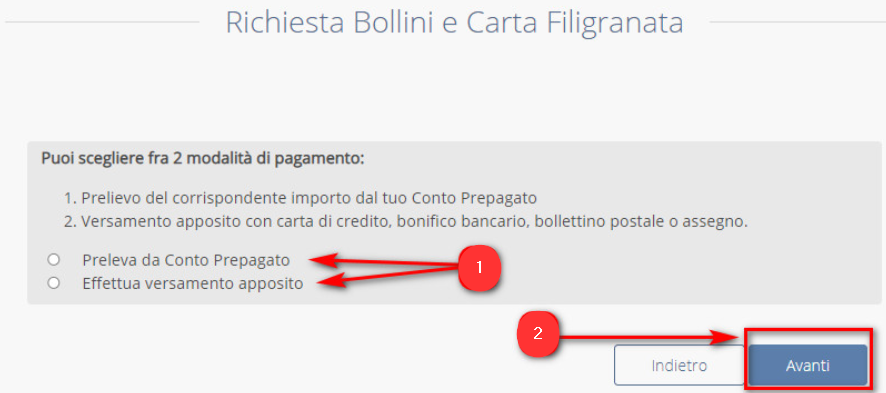 Selezionare la modalità di pagamento che si desidera utilizzare per l’acquisto del materiale (1) e proseguire AVANTI (2):