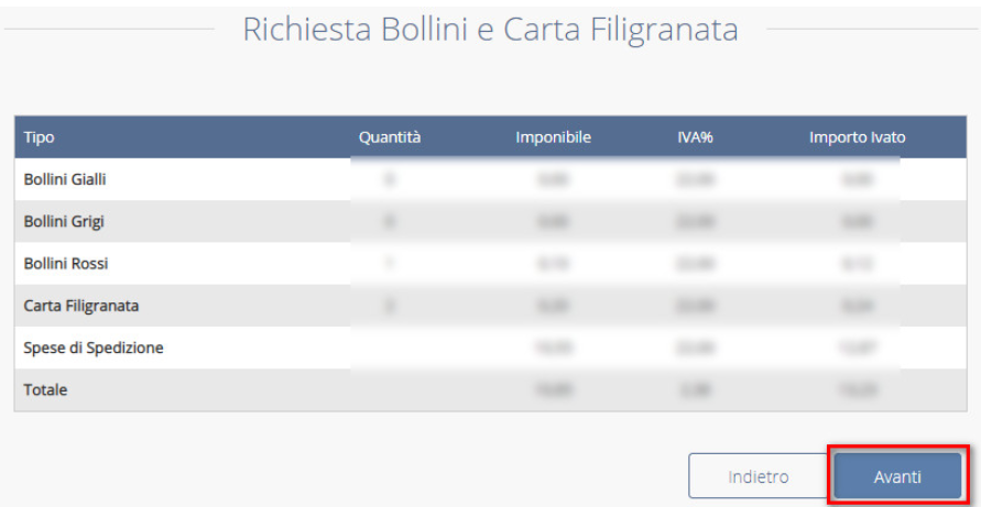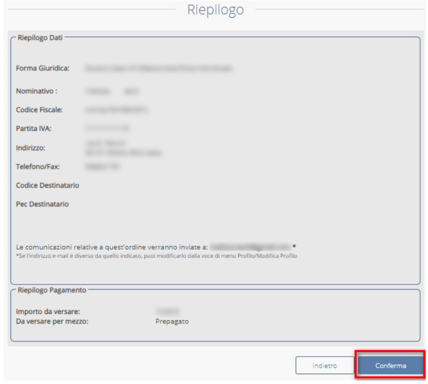 Proseguendo avanti, si visualizzerà il riepilogo del pagamento e, cliccando su CONFERMA il sistema in automatico addebiterà il costo del materiale scelto: