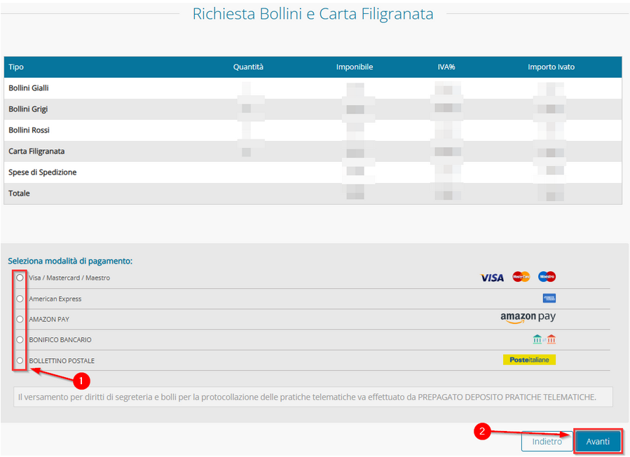 Qualora come modalità di pagamento fosse stato scelto EFFETTUA VERSAMENTO APPOSITO, nella schermata con il dettaglio dell’acquisto il sistema chiederà di selezionare anche la modalità di pagamento (1) che si desidera utilizzare, successivamente, proseguire AVANTI (2):
