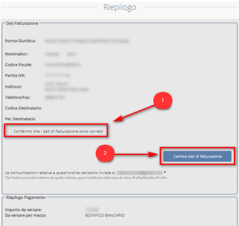 Nella schermata successiva, il sistema mostrerà i dati di fatturazione. Se quest’ultimi sono corretti, basterà selezionare la voce Confermo che i dati di fatturazione sono corretti (1), qualora fossero errati, cliccare sul tasto Cambia i dati di fatturazione (2):