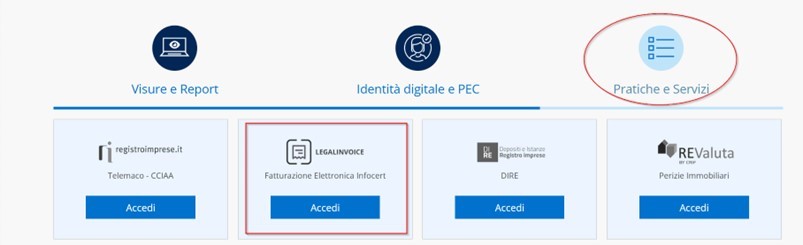 Dopo aver effettuato il login con le proprie credenziali, cliccare sulla voce ACCEDI, presente nel riquadro denominato Fatturazione Elettronica InfoCert all’interno della colonna Pratiche e Servizi: