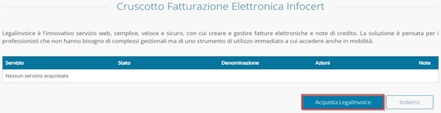 Cliccare su CRUSCOTTO in alto a destra, nella schermata successiva, selezionare l’opzione ACQUISTA LEGALINVOICE: