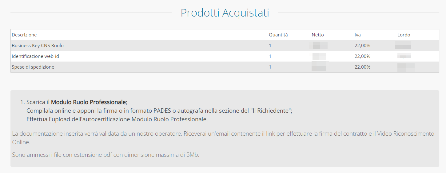 - DOCUMENTAZIONE NON INSERITA, questo stato si visualizza quando si acquista una firma digitale con ruolo.