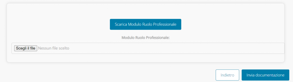 Scaricare il Modulo Ruolo Professionale compilarlo online e firmarlo in modalità AUTOGRAFA e riallegarlo nella sezione scegli file che si visualizza nelle schermate sotto e cliccare su Invia Documentazione.