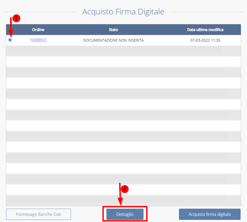 Selezionare l’ordine nello stato DOCUMENTAZIONE NON INSERITA ed aprire il relativo Dettaglio.