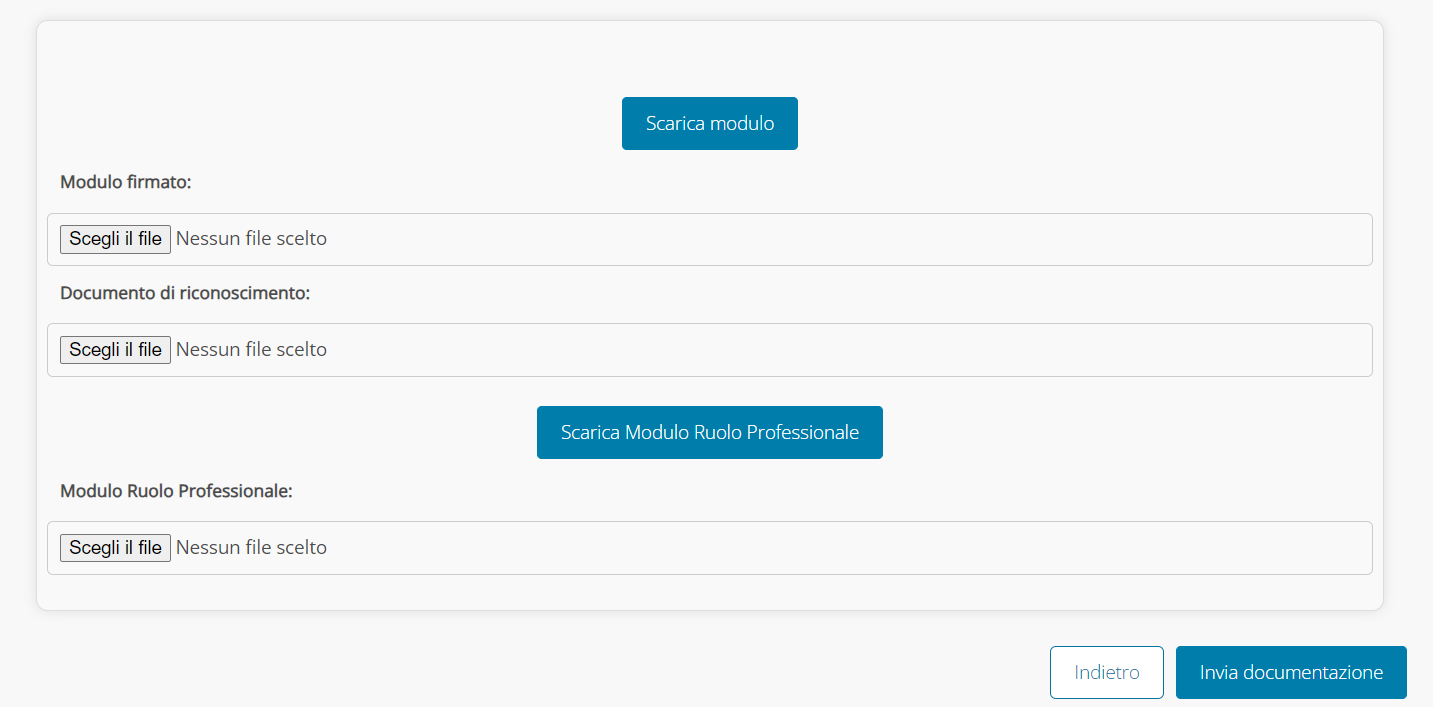 Scaricare i moduli compilarli online e firmarli in modalità PADES e riallegarlo nella sezione scegli file che si visualizza nelle schermate sotto e cliccare su Invia Documentazione.