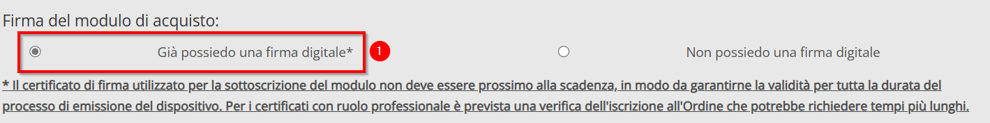 Dopo aver selezionato il tipo di firma digitale che si desidera acquistare, sarà necessario scegliere la tipologia di riconoscimento da utilizzare. Se si è già in possesso di una firma digitale in corso di validità si dovrà selezionare: