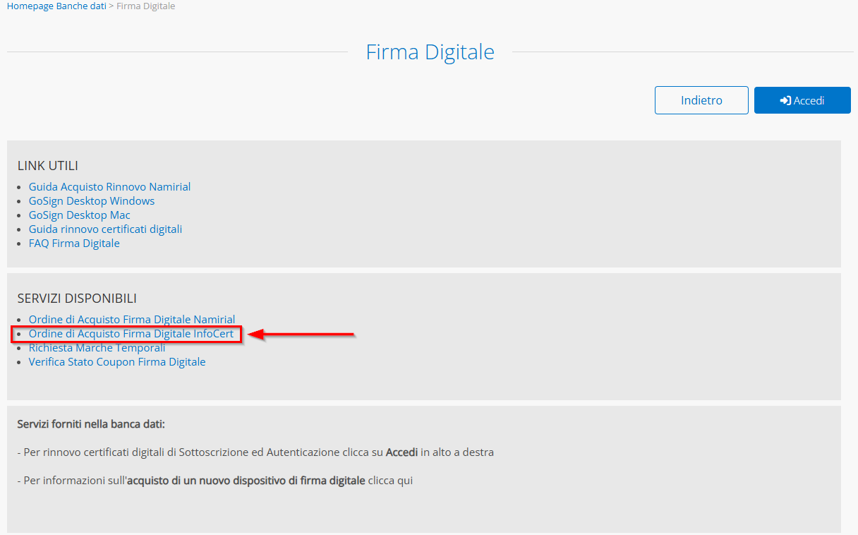 Dopo aver completato il pagamento, riceverà un’e-mail per completare la procedura. Tornare sull’home page della banca dati FIRMA DIGITALE ed accedere alla sezione Ordine di Acquisto Firma Digitale Infocert.