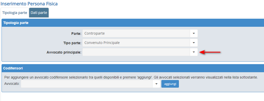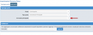 Per inserire l’avvocato di una parte, è necessario aprire l’anagrafica della Parte interessata e selezionare l’avvocato desiderato dal menù Avvocati Principale