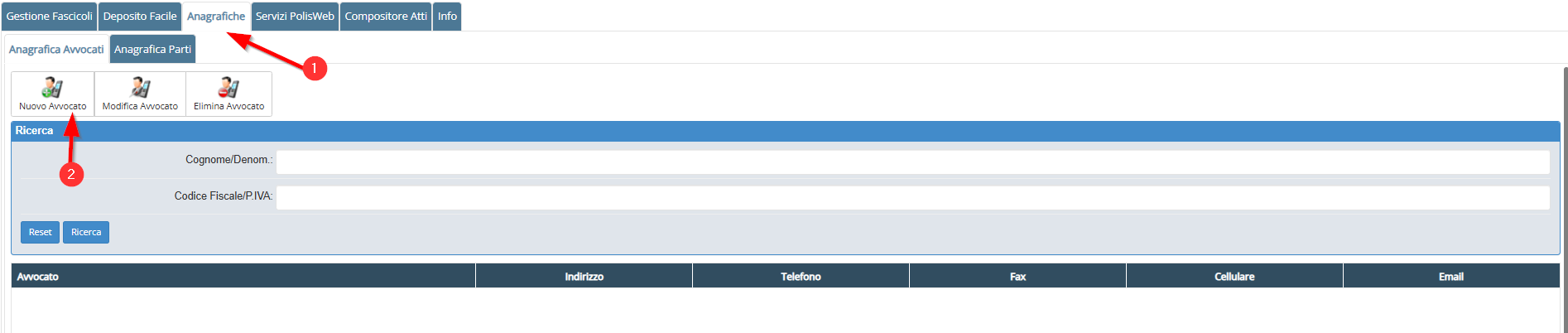 Nella scheda Anagrafiche Avvocati, cliccare sul tasto Nuovo Avvocato quindi inserire i dati dell’avvocato e cliccare su SALVA.
