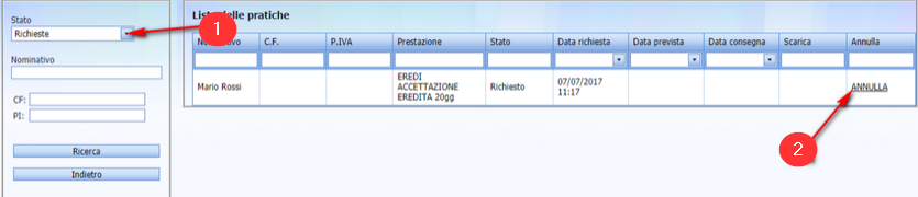Selezionare, nel menù a tendina, la voce RICHIESTE (1). Al centro della pagina si visualizzerà la richiesta inserita, per annullarla, occorrerà cliccare sulla voce ANNULLA (2) presente all’estrema destra: