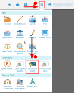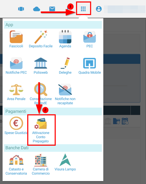 Per collegare l’utenza Quadra al conto prepagato finalizzato al pagamento dei fascicoli e delle spese di giustizia, occorre autenticarsi mediante firma digitale/SPID o CIE, cliccare in alto a destra sul menu di accesso alle applicazioni (1) e successivamente sulla funzione Attivazione conto prepagato (2)