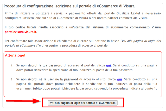 In entrambe i casi, per proseguire, sarà necessario cliccare infondo sulla funzione Vai alla pagina di Login del portale eCommerce: