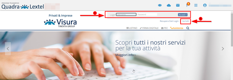Verrà mostrata a video l’home page del portale e sarà necessario inserire i dati login (1) nel caso di utente iscritto oppure iscriversi cliccando sulla funzione Iscriviti(2):