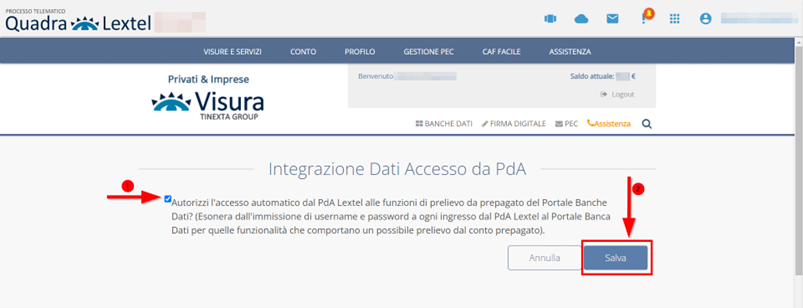 Dopo aver inserito i dati login, verrà mostrato a video il messaggio di “Integrazione dati Accesso da Pda”: qui occorre mettere il flag per prestare il consenso (1) e cliccare infondo su Salva (2):