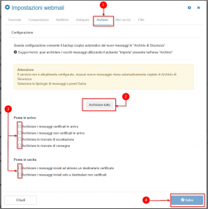 La scheda permetterà di personalizzare le impostazioni dei salvataggio, sia per la posta in arrivo che per quella in uscita scegliendo, di salvare selettivamente alcune tipologie di messaggio selezionando l’opzione corrispondente (2) , oppure archiviare tutta la corrispondenza cliccando sul pulsante Archiviare tutto (3).