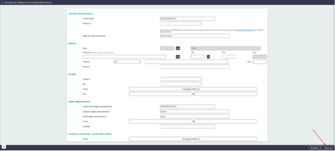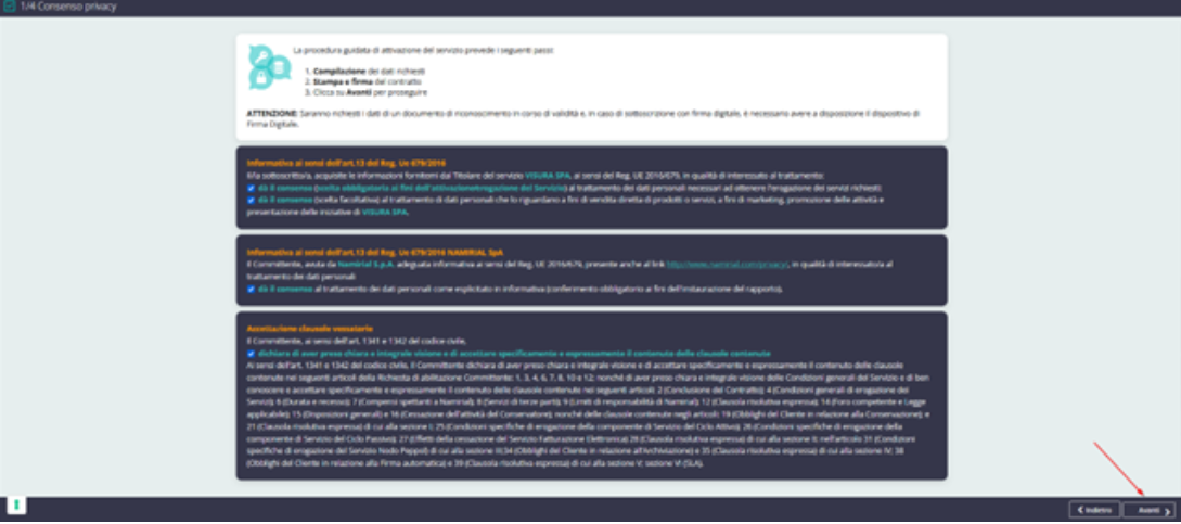 Compilare il format che si visualizzerà a video indicando i dati del soggetto che aderisce al servizio, al termine, proseguire cliccando AVANTI in basso a destra: