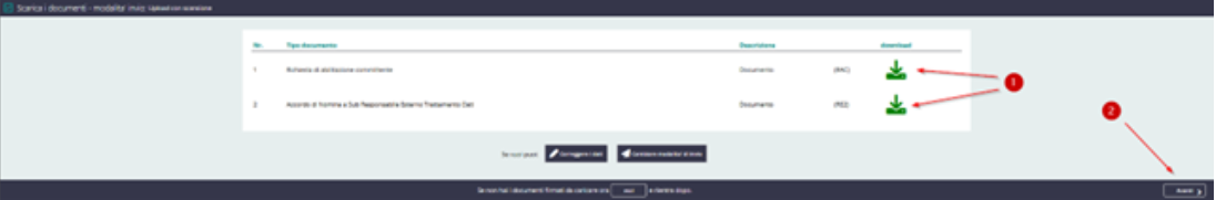Per ogni contratto, cliccare sul tasto presente nella colonna download (1) per scaricare il relativo PDF sul proprio computer. Dopo aver scaricato tutti i contratti, proseguire cliccando AVANTI (2) in basso a destra: