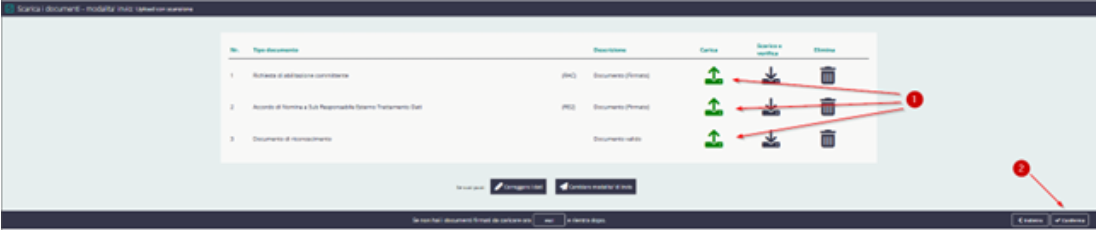 Dopo aver effettuato la firma, nella schermata presente a video, cliccare sull’icona per caricare i documenti (1) per ogni file ed eseguire l’upload dei file firmati. Al termine, cliccare su CONFERMA (2) in basso a destra: