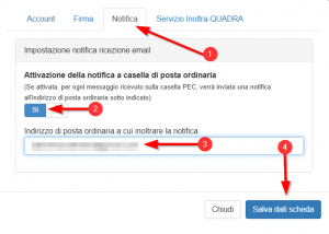 Selezionare la scheda Notifica, in “Attivazione della notifica a casella di posta ordinaria”  indicare SI, specificare l’indirizzo ordinario dove inoltrare le email di notifica e, infine, cliccare sul tasto Salva dati scheda.