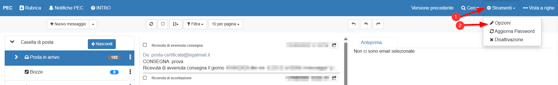 Dopo l’apertura della schermata del Client PEC, selezionare, in alto a destra, la sezione STRUMENTI e nel sottomenù OPZIONI.