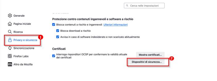 Cliccare su Firefox e nel sottomenù Preferenze, in Privacy e Sicurezza(1) scendere fino a Certificati Dispositivi di sicurezza(2)