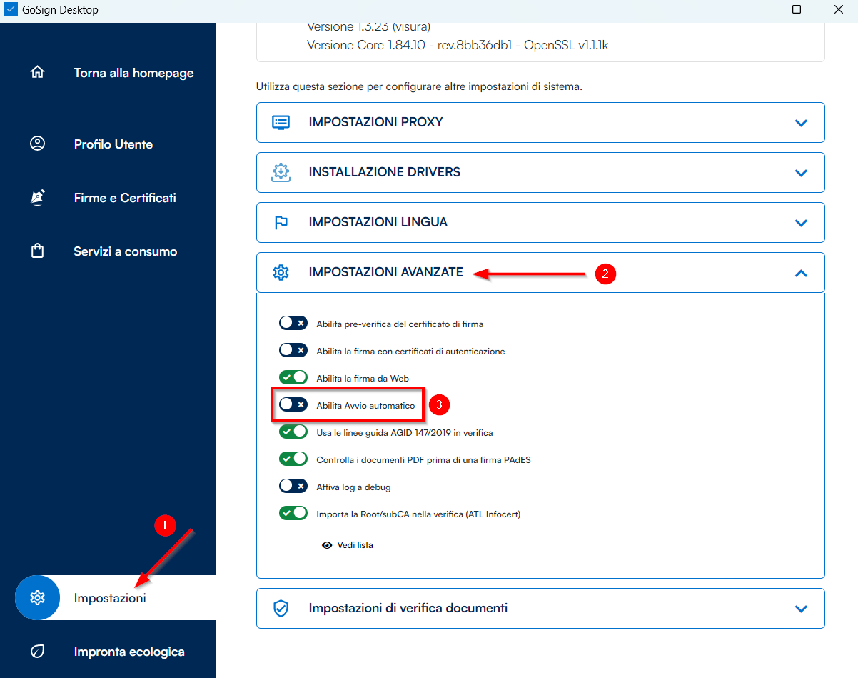 Dopo il riavvio del computer disattivare l’avvio automatico dal Gosign Desktop è necessario ciccare su Impostazioni (1) e cliccare su IMPOSTAZIONI AVANZATE (2) e da qui si potrà disattivare Abilita Avvio Automatico (3) cliccando sul quadratino verde: quando diventa blu, significa che l’opzione è stata disattivata correttamente.