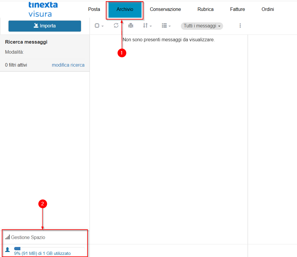 Accedere sulla webmail e selezionare, in alto a sinistra la funzione Archivio (1),