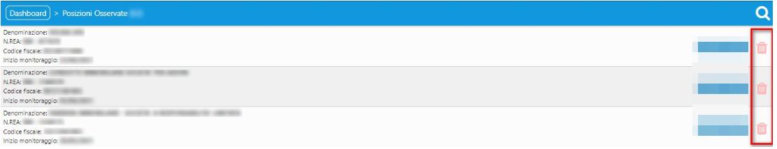Nell’elenco il sistema proporrà tutte le imprese e/o immobili osservati. Per eliminare l’impresa, sarà necessario cliccare sull’icona del cestino presente sull’estrema destra in corrispondenza della società di proprio interesse: