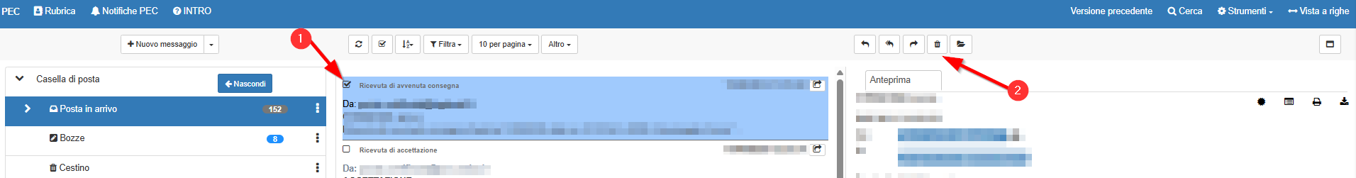 Per la cancellazione dei messaggi pec all’interno del client pec in Quadra, una volta effettuato l’accesso all’applicazione Client Pec, occorre selezionare il messaggio da eliminare e cliccare sul tasto Cestina ![]()