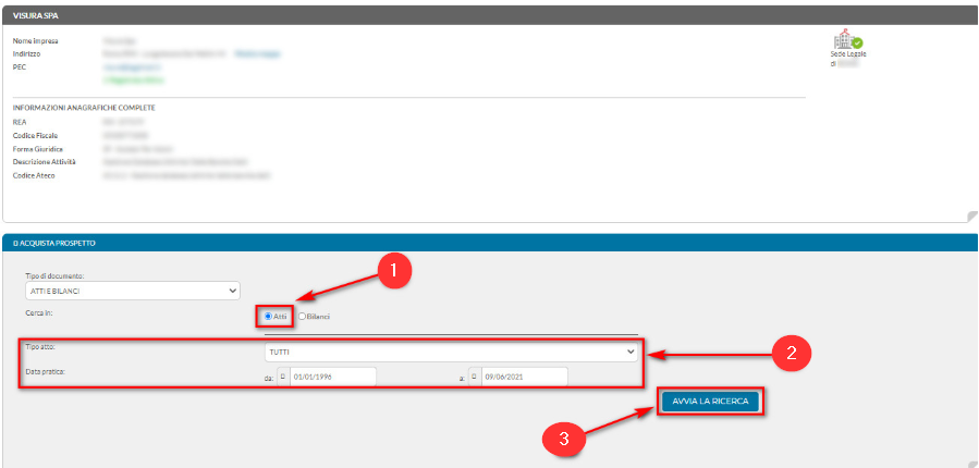 Lasciare selezionata la voce ATTI (1), nella sezione Tipo Atto e Data Pratica (2) è possibile selezionare un atto specifico e una data o in alternativa lasciare i campi che ci sono impostati di default dal sistema e, infine, cliccare su AVVIA LA RICERCA (3):