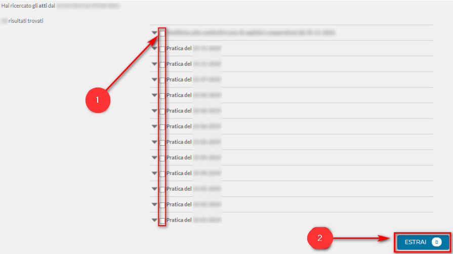Il sistema mostrerà a video l’elenco degli atti reperiti sul server del fornitore in base ai parametri di ricerca. Sarà necessario selezionare l’atto di proprio interesse (1) e cliccare su ESTRAI (2):