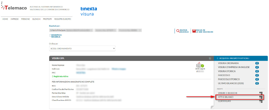 A video si visualizzerà l’impresa reperita sui parametri di ricerca inseriti. Sull’estrema destra, cliccare sulla voce ATTI E BILANCI: