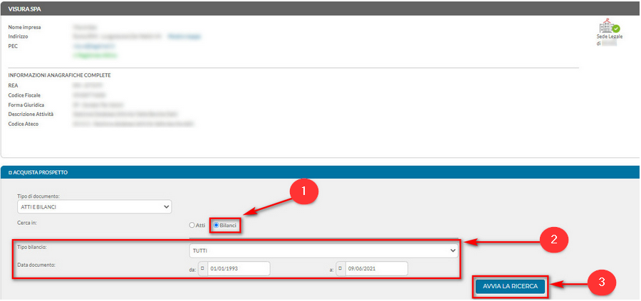 Selezionare la voce BILANCI (1), nella sezione Tipo Bilancio e Data Documento (2) è possibile selezionare un bilancio specifico e una data o in alternativa lasciare i campi che ci sono impostati di default dal sistema e, infine, cliccare su AVVIA LA RICERCA (3):