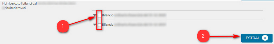 Il sistema mostrerà a video l’elenco dei bilanci reperiti sul server del fornitore in base ai parametri di ricerca. Sarà necessario selezionare il bilancio di proprio interesse (1) e cliccare su ESTRATI (2):