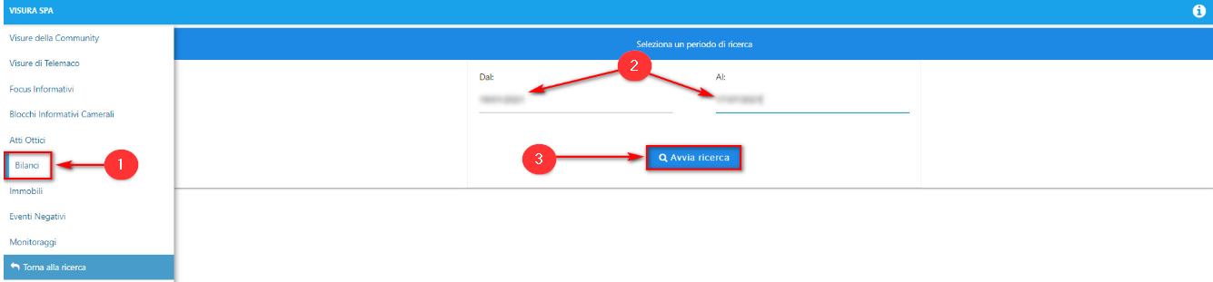 Sulla sinistra, cliccare sulla voce BILANCI (1). Indicare, al centro della pagina, le date indicative di quanto è stato emesso il bilancio (2) e cliccare su AVVIA LA RICERCA (3):