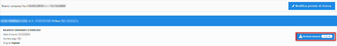 Il sistema mostrerà a video tutti i bilanci reperiti per l’impresa e l’arco di tempo ricercati. Cliccare su RICHIEDI BILANCIO:
