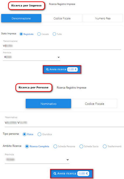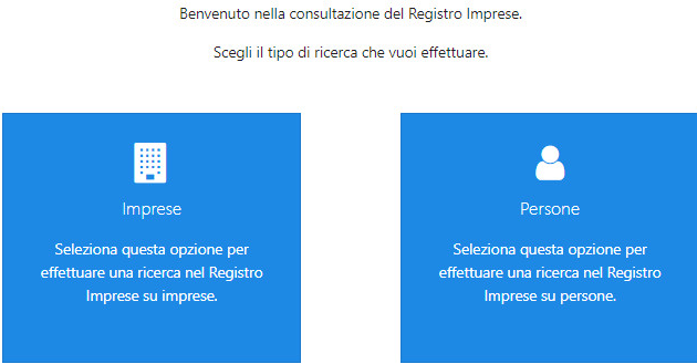 Selezionare il riquadro IMPRESE o PERSONE in base alla tipologia di ricerca che si desidera effettuare: