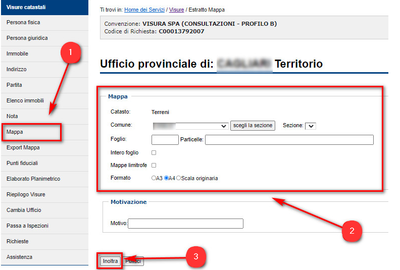 Nel menù laterale di sinistra, selezionare la voce MAPPE (1), indicare, al centro della pagina, i dati per eseguire la ricerca (2) e infine cliccare su INOLTRA (3):
