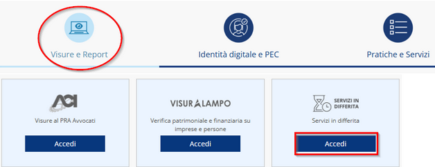 Dopo aver effettuato il login con le proprie credenziali, cliccare sulla voce ACCEDI, presente nel riquadro rinominato Servizi in Differita nella colonna Visure e Report: