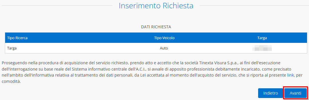 Il sistema mostrerà a video il riepilogo della richiesta effettuata, cliccare su AVANTI:
