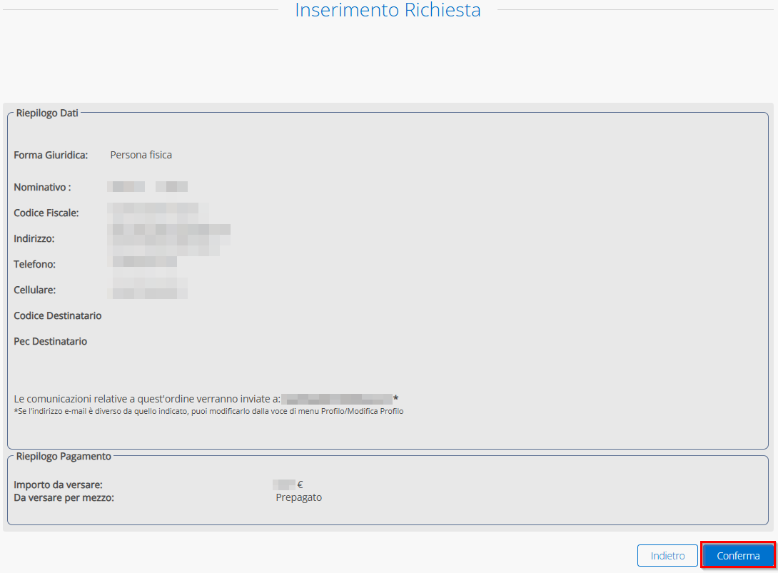 Per completare l’inserimento della richiesta, cliccare su CONFERMA alla richiesta del pagamento: