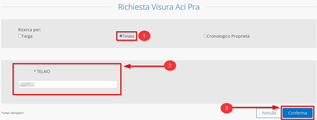 Selezionare la ricerca per TELAIO (1) e indicare il dato di ricerca (2), infine, cliccare su CONFERMA (3):